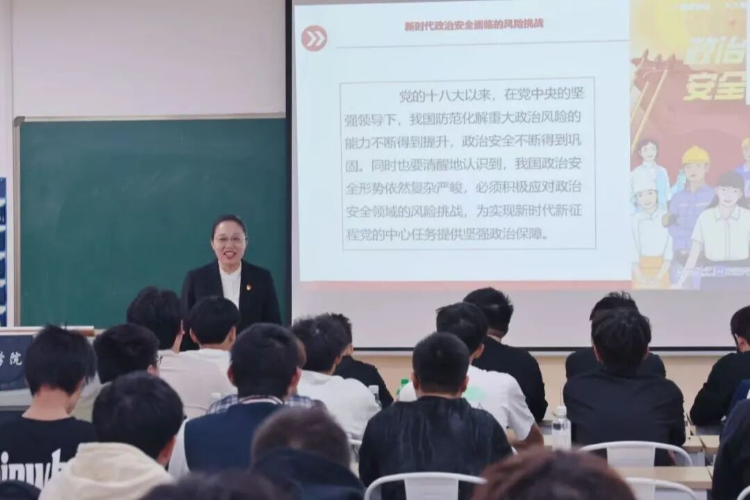 鲁晓芹结合图片、视频从多方面展开讲解。她指出,新时代政治安全形势复杂,意识形态领域斗争尖锐。在剖析斗争态势时,她列举了通过价值观、宗教、非政府组织及文化等多种形式,解读了西方势力“六化”瓦解策略,帮助同学们看清意识形态领域斗争的复杂性与长期性。