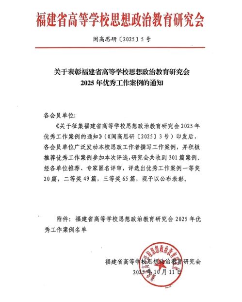 据悉,福建省高等学校思想政治教育研究会于2025年5月启动征集,共收到301篇案例,经专家匿名评审,最终评选出优秀工作案例一等奖20篇,二等奖49篇,三等奖65篇。